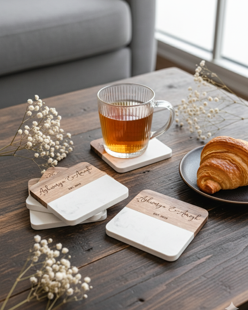 Eleve su espacio con nuestros exquisitos posavasos de mármol y madera de acacia grabados con láser. Agregue un toque de elegancia y personalización a la decoración de su hogar o a sus regalos con estos posavasos premium.